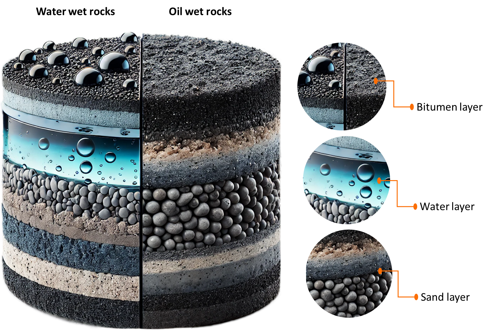 Depending on their composition, such rocks are divided into two types: water-wet rocks, where bitumen is separated from the mineral part by a water layer, and oil-wet rocks, where bitumen has penetrated the mineral structure, making its separation extremely challenging.